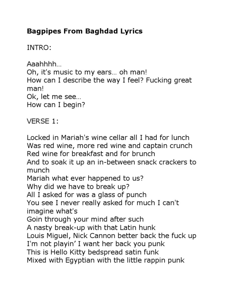 Bagpipes From Baghdad Lyrics PDF Leisure Bagpipes From Baghdad Lyrics Meaning Oh, it's music to my ears, oh man / how can i describe the way i feel? the song “bagpipes from baghdad” by eminem is a track from his 2009 album “relapse.”. the cultural collisions in verse. the song bagpipes from baghdad by eminem is a track from his album relapse released in 2009. Concerning the track’s. Bagpipes From Baghdad Lyrics Meaning.
